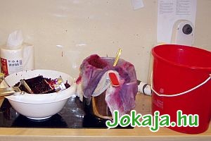 Mossuk meg a ribizlit és a legnagyobb leveleket szedjük ki belőle. Nagyon lelkesek nekiállhatnak lebörzögetni a száráról, de mivel úgy is szűrve lesz, akár rajta is maradhat. Tegyük egy jókora edénybe – jelen esetben ez a fedeles vödör volt, és zúzzuk össze a szemeket, hogy jobban kiadják levüket. Minden kiló ribizlihez öntsünk egy liter vizet és lefedve, hűvös helyen hagyjuk állni egy napig. Ez alatt még nem kezd el erjedni, viszont kiázik a leve és a festék a szemek héjából. Szűrjük le a levét és a szemeket préseljük ki. Legegyszerűbb sok adagban, krumplinyomóval és erős kézzel. A krumplinyomóból kikerült, még sok aromát és színt tartalmazó maradékot is felönthetjük likőrnek, kiegészítve a már eltettet.